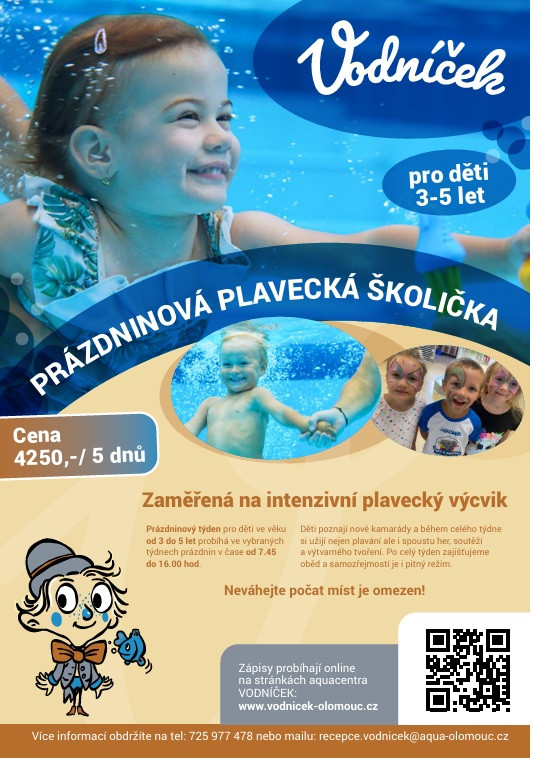 Letos poprvé aquacentrum VODNÍČEK pořádá prázdninové campy - "PRÁZDNINOVÉ PLAVECKÉ ŠKOLIČKY" pro děti ve věku 3 - 5 let zaměřené na osvojení a prohloubení plaveckých dovedností.